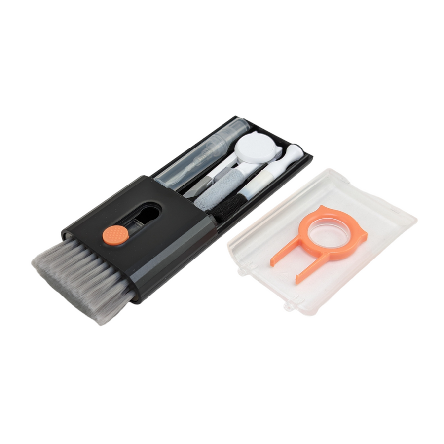 Thock King's innovative 10-in-one solution for your mechanical keyboard cleaning needs! Use the front switch to reveal large keyboard brush or slide off the clear cover to access variety of specialty cleaning tools including a keycap puller, spray bottle and more.