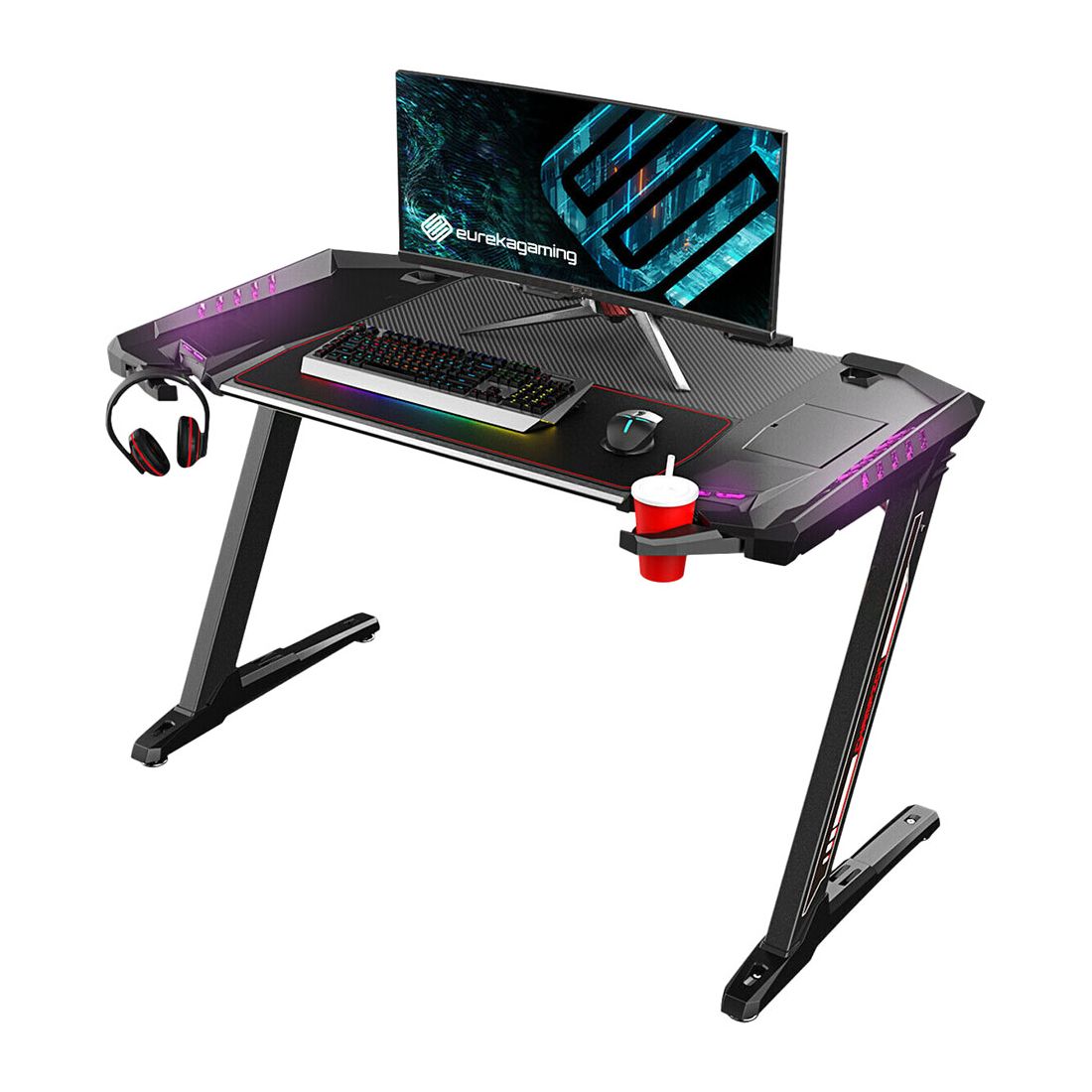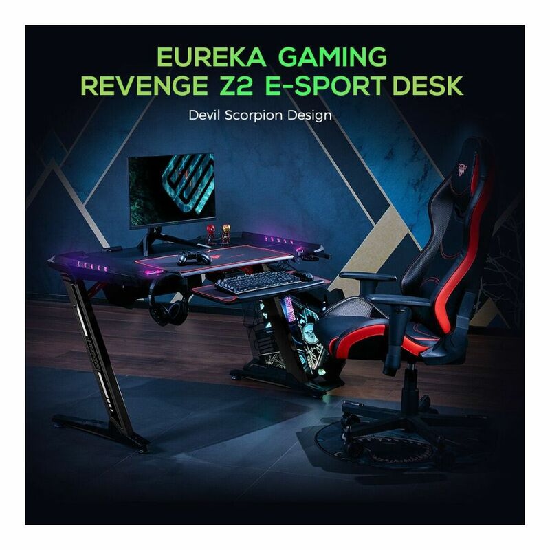 Stop gaming on your old boring office desk and level up!. The Eureka Z2 Gaming Desk utilizes an ultra stable and sturdy Z-shaped leg design to stand up to your gaming demands. The Z2 was built by gamers for gamers with features unlike any other gaming desk. Built-in retractable cup holder and headphone hook. Cable management and a side compartment for a power supply. Scroll down to learn more about the Z2 features. Keep your battle station clean with the Z2 cable management system!. The gaming surface has multiple cable ports to route your cables under the desk freeing up value space for your gaming gear. In the centre of the desktop is a slot with cable ports for your mechanical keyboard and gaming mouse cables. At the rear of the desk are cable ports for your monitor and speaker cables. The Z2 also has a side compartment for a power strip. Watch your desk come alive with dynamic RGB LED lights!. You can select your favourite colour or switch on the multi-colour light show. Simply plug your desk (the USB cable) into your gaming pc, gaming laptop, Xbox, or PS4 and let the light show begin!.