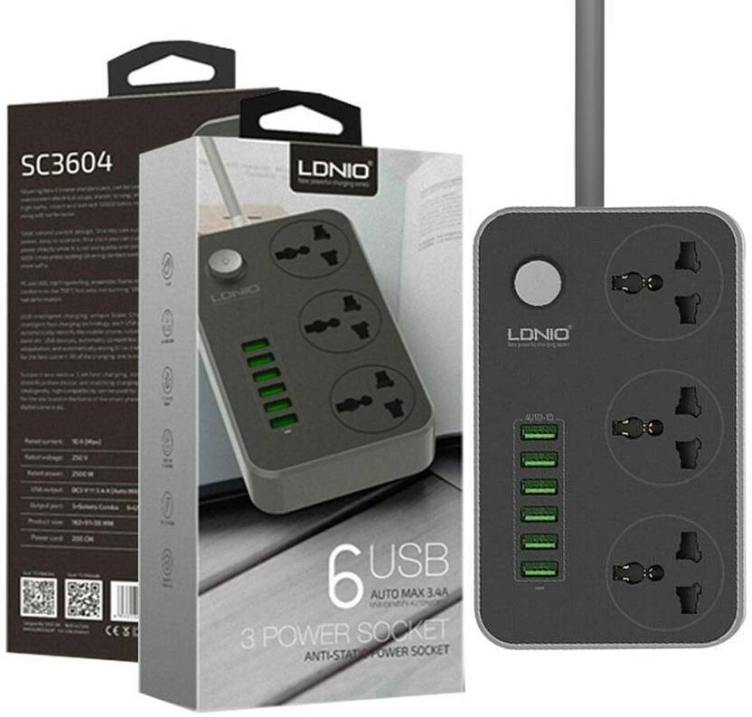- Has 6 USB 3.4 A Power Strip Extension Cord with USB Port and Surge Protector Ports with Indicator, 3 Universal Sockets , 2 m Cable with 2 iPhone Cables