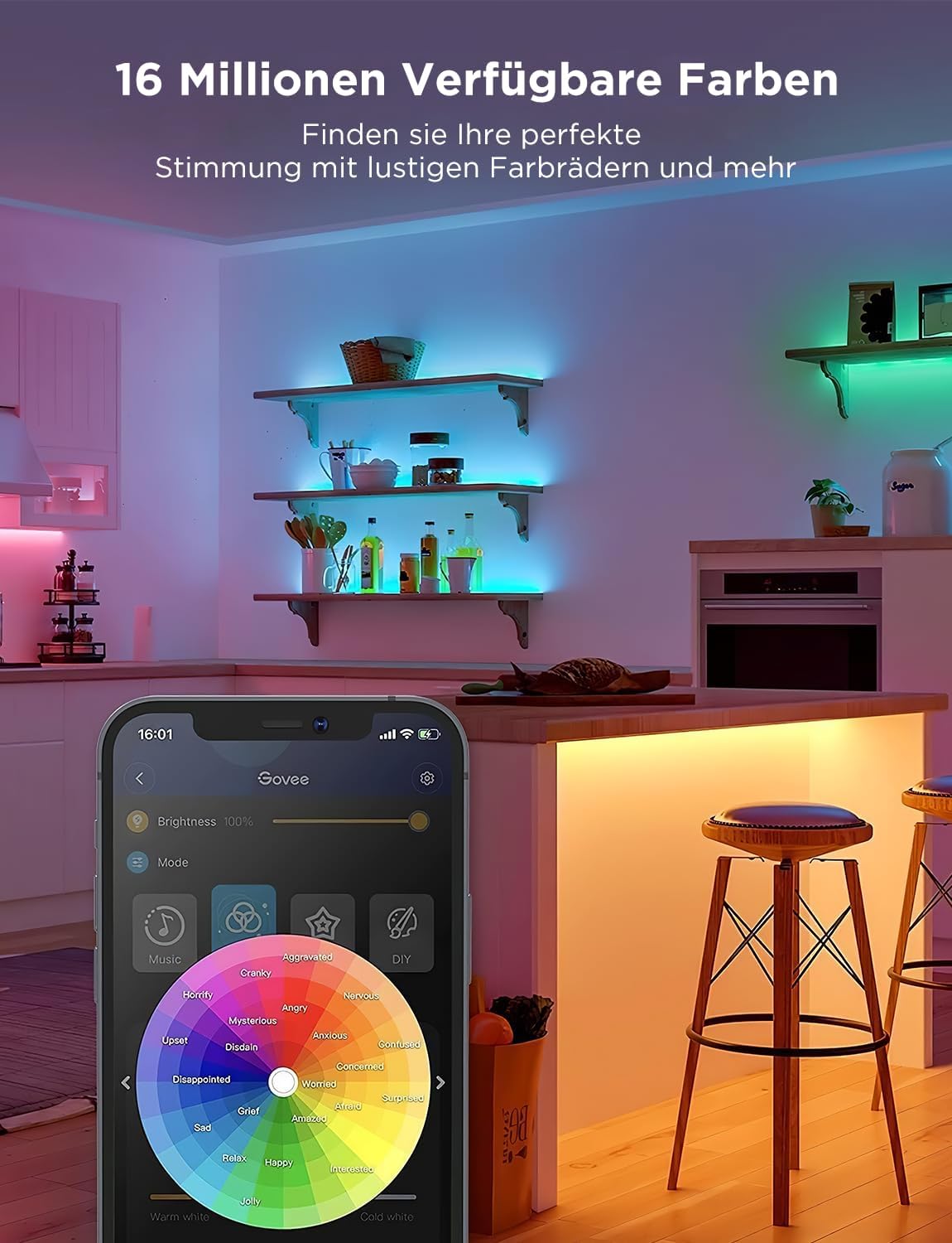 • DIY mode: with Govee Home app, you can adjust personal lighting effects for Govee LED strip 30 m in DIY mode. Not intended for lighting. Used only to create atmosphere.