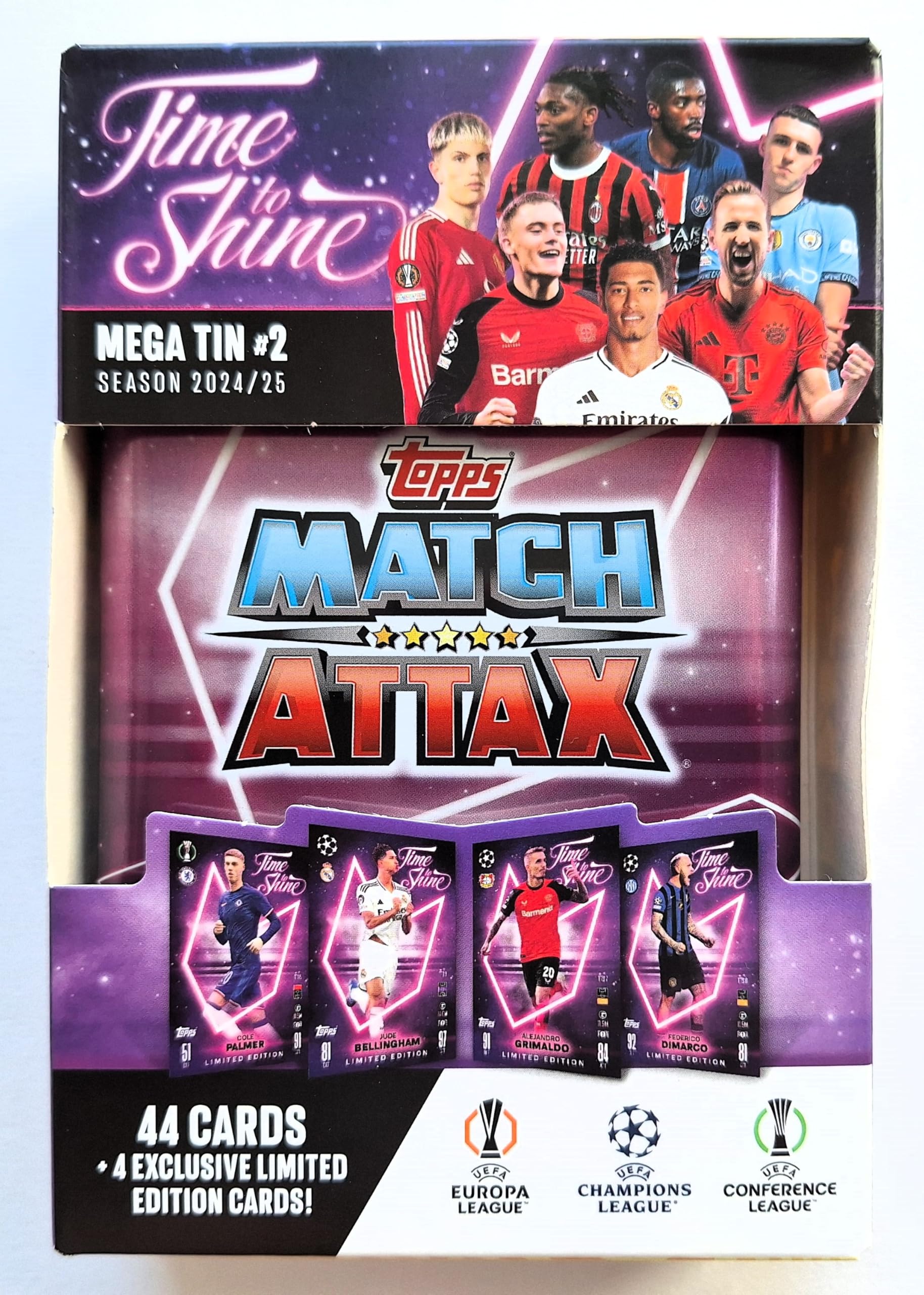 • The Mega Tin 2 "Time to Shine" contains 44 Match Attax cards plus 4 exclusive LE's - Cole Palmer, Jude Bellingham, Alejandro Grimaldo and Federico Dimarco!